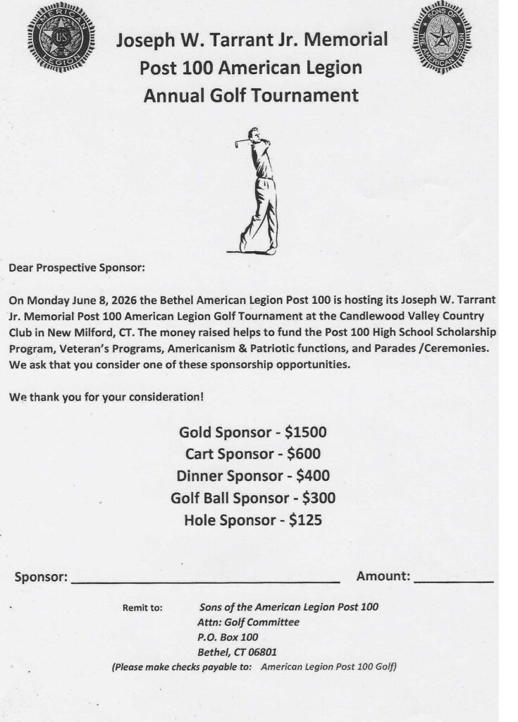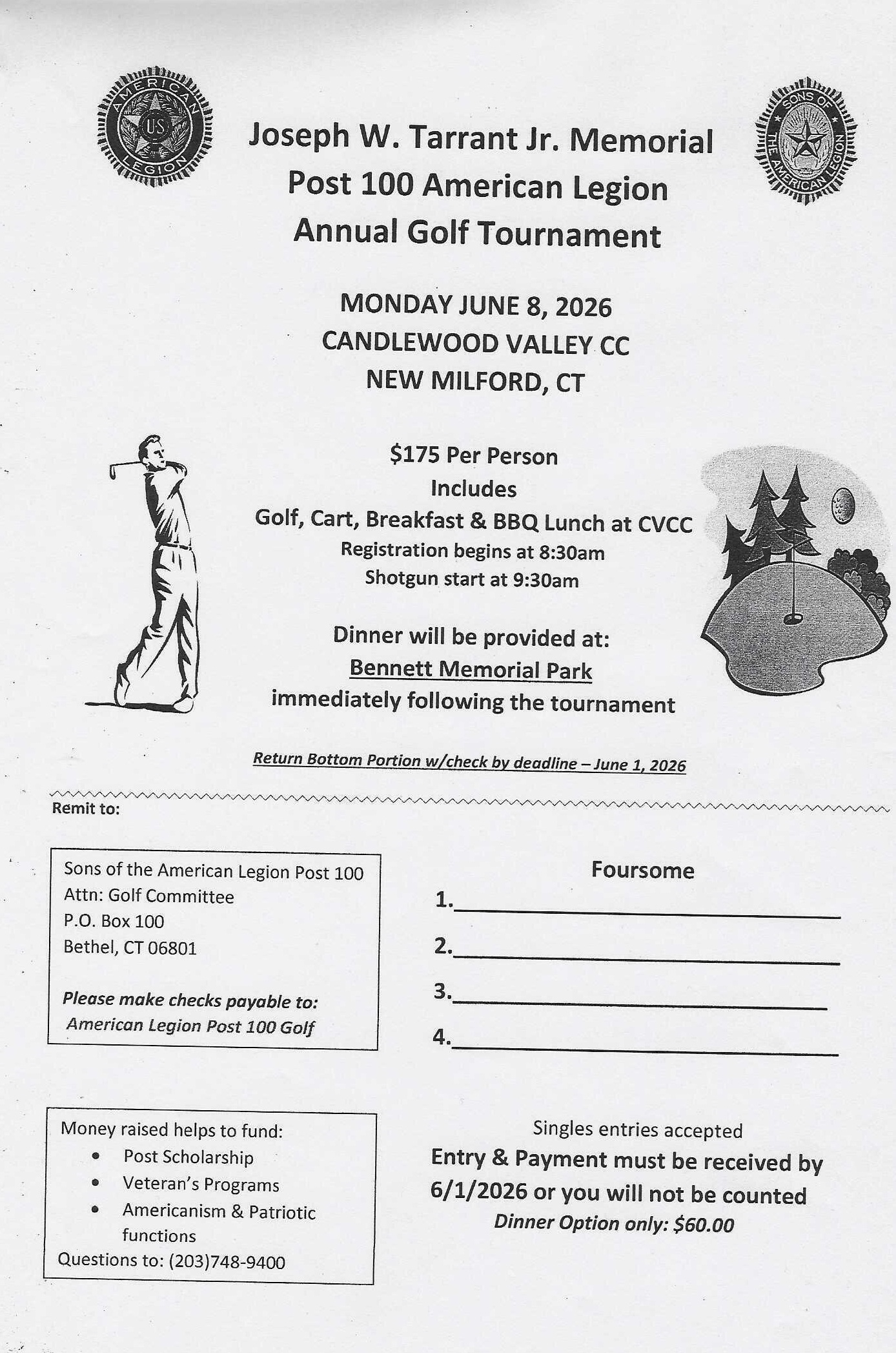 The 2026 Post 100 Golf Tournament is to be held Monday June 8. If you would like to attend or participate as a sponsor please click on one of the choices below to get a full page sign up document